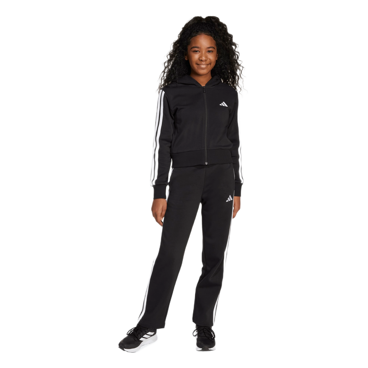 Introducing the Essentials Tracksuit for juniors, designed to keep up with their active day. This regular fit tracksuit, featuring a top and bottom, is crafted from 70% cotton and 30% recycled Polyester, ensuring comfort and ease. The modern design, complete with the iconic 3 stripes and embroidered sign-off, offers a clean, versatile style perfect for everyday wear. With a snug hood, open hem pants, and a centre front full zip, this tracksuit is made in part with recycled and renewable materials, making it both practical.