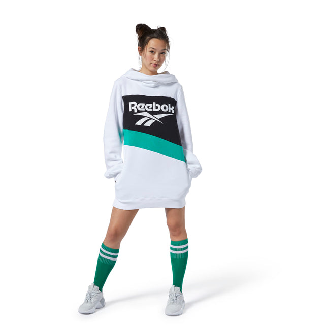 فستان هودي كبير الحجم للسيدات مستوحى من أسلوب التسعينيات. تخلق الكتل الهندسية من الألوان والتفاصيل المنقطة على الأكمام لمسة عتيقة. يوفر خط العنق العالي التغطية والمظهر المريح للغاية. الصوف الفاخر يجعله ناعمًا ودافئًا.
