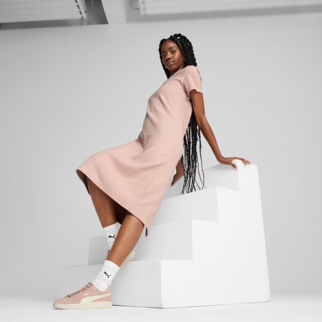 A loose-fitting dress with a shell trim at the neckline and a slit at the back for freedom of movement. This style will not go unnoticed. The subtle embroidered PUMA Cat logo adds a touch of sporty elegance. Perfect for everyday wear.