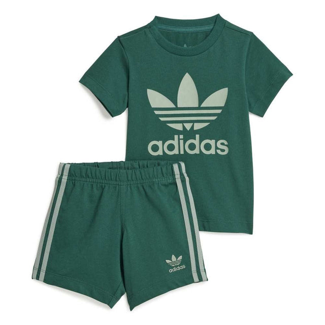 The playdate outfit they'll want on repeat. Your little one is ready for anything in this infants' shorts and tee set from adidas. The iconic Trefoil logo and 3-Stripes combine with a ribbed crewneck for a classic sport-inspired look. The drawstring elastic waist, snap-button shoulder and single jersey materials keep the comfort strong.