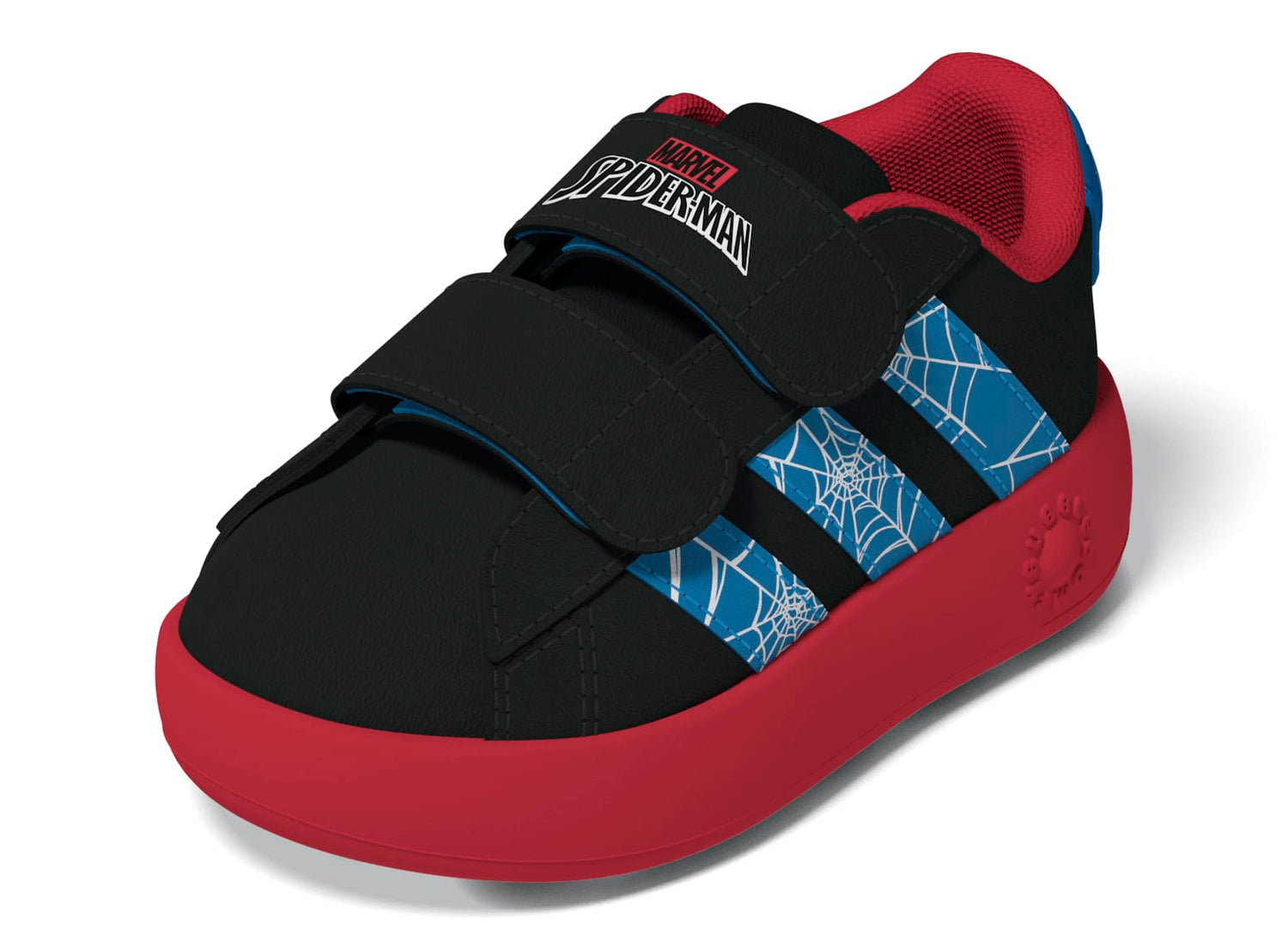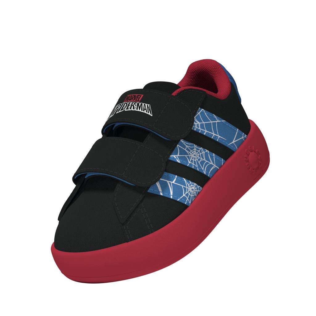 These infants' adidas shoes let little ones take their first steps with Marvel's Spider-Man. A 3D Spider-Man head on the heel and webbed 3-Stripes on the sides add playful Super Hero style. A synthetic upper and a Bubblecomfy outsole offer flexible comfort and a soft, cushioned feel for all-day adventure. Hook-and-loop straps make these shoes easy to slip on and off so nothing gets in the way of play.