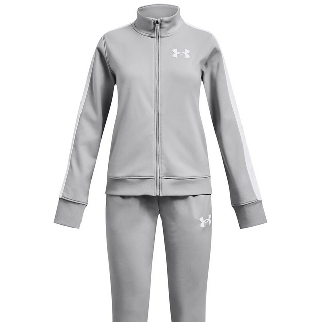 Lovely Under Armour tracksuit consisting of a cardigan with zipper and a pair of track pants. The Set is grey with the Under Armour rubber logo in white on the left chest and left thigh. The Tracksuits has white, vertical stripes down the sleeves and legs.