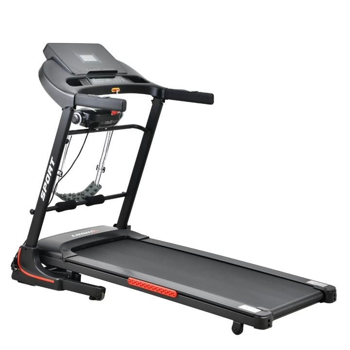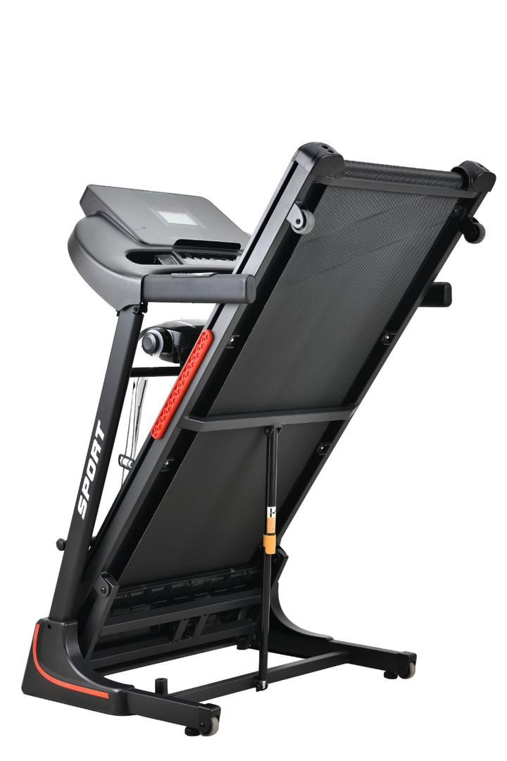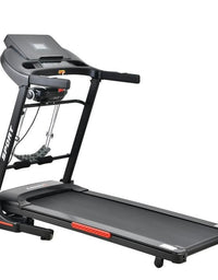 The RS-80 supports a max user weight of 140 KG and has a powerful 2.5 HP motor. It offers a speed range of 1.0 to 16 km/h. The running surface is 500x1300mm. The LED monitor displays time, speed, distance, and calories. A key feature is its 18 levels of automatic incline. It operates on 220-240V~ voltage and 50-60Hz current.